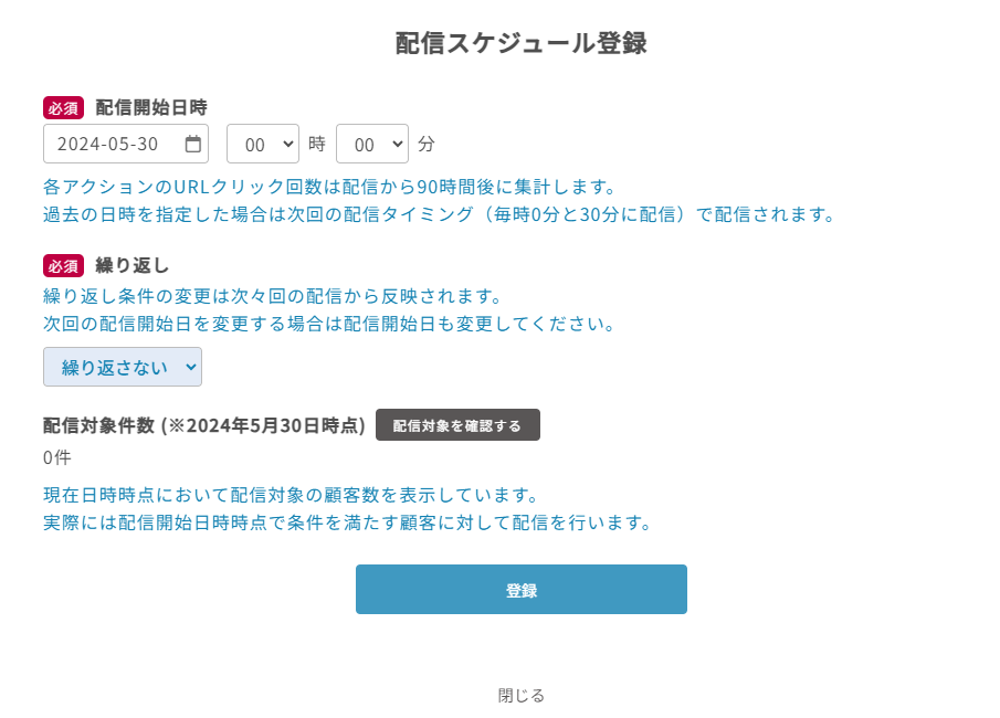 - 「配信スケジュール登録」をクリックすると、