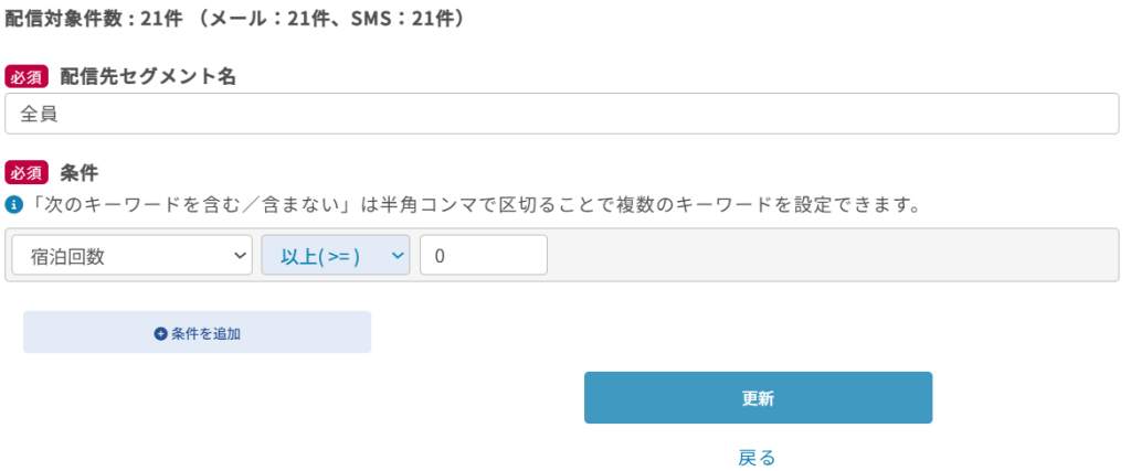 - 配信先セグメント名や条件を編集し「更新」をクリックしてください。