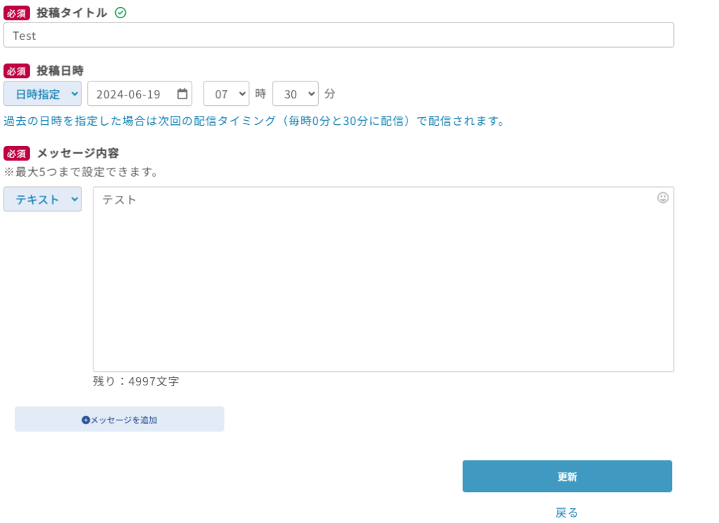• 投稿日時やメッセージ内容を編集し「更新」をクリックしてください。