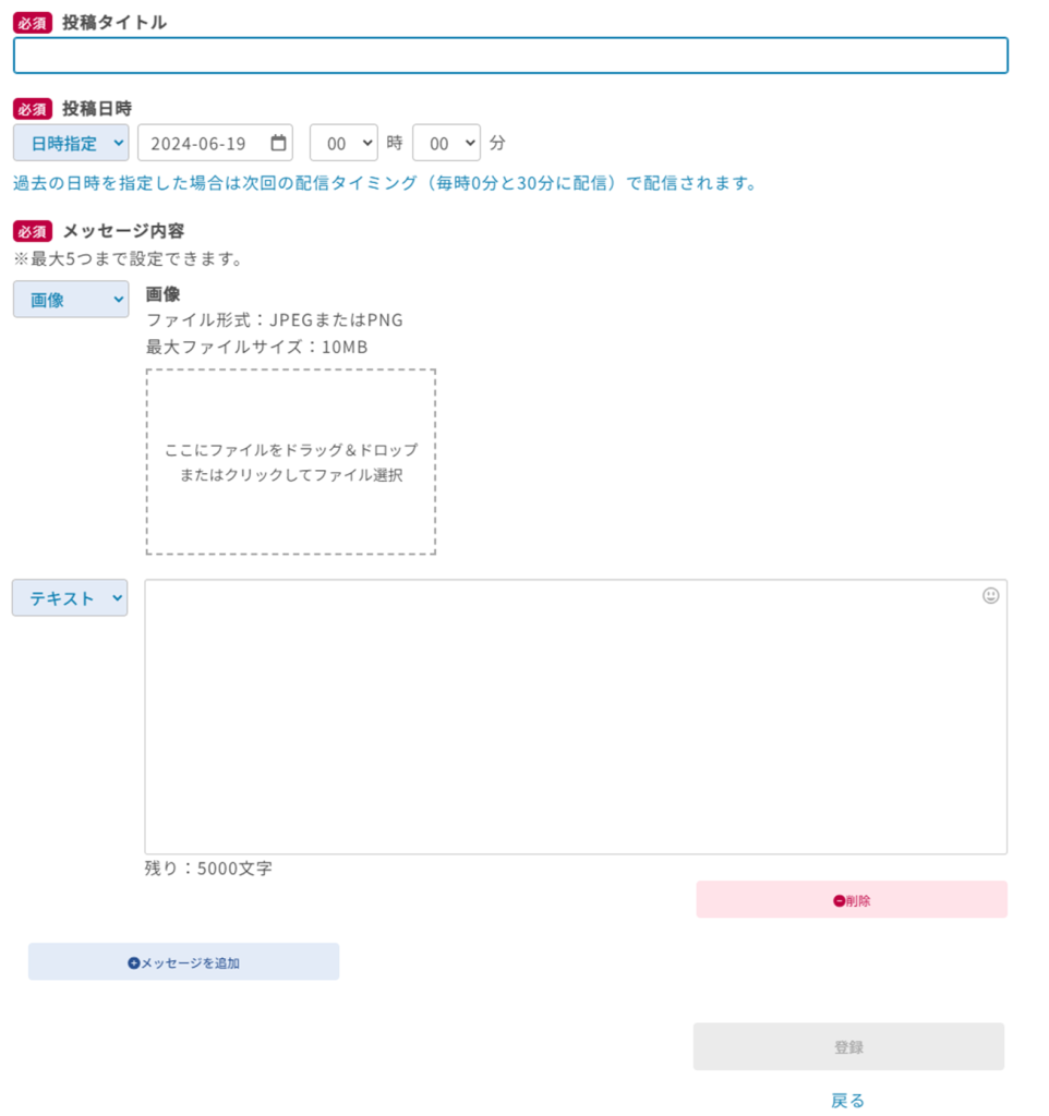 • 各項目を入力し、追加したいメッセージがあれば「メッセージを追加」より、