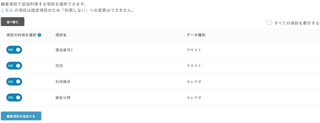 表示されるようになります。 - 「顧客項目を追加する」をクリックしてください。